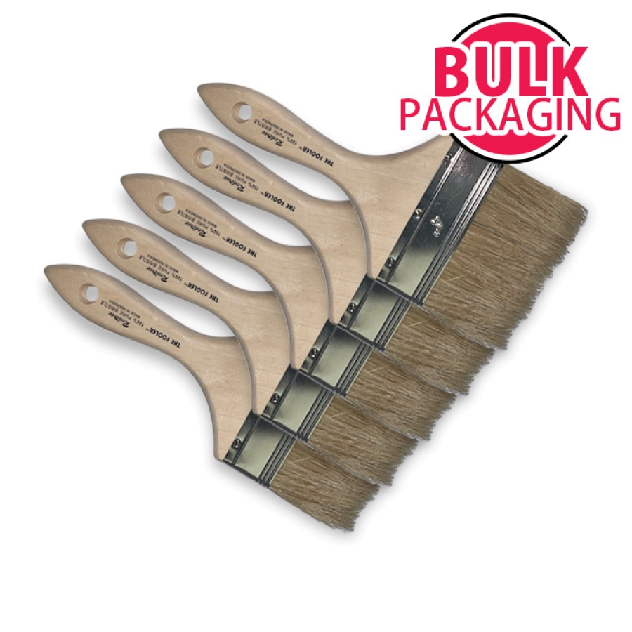 There are 7 Fooler® brand disposable paint brushes that are sold in packages of 36 and 6 Fooler® brand disposable paint brushes that are sold in bulk packages of 200. The Fooler® brushes are made with Hog bristle, set into a wood handle. Other selectable parameters include: trim length; size; thickness; brush type; handle type; trim type; and use. The Fooler® Chip brushes are all double density.